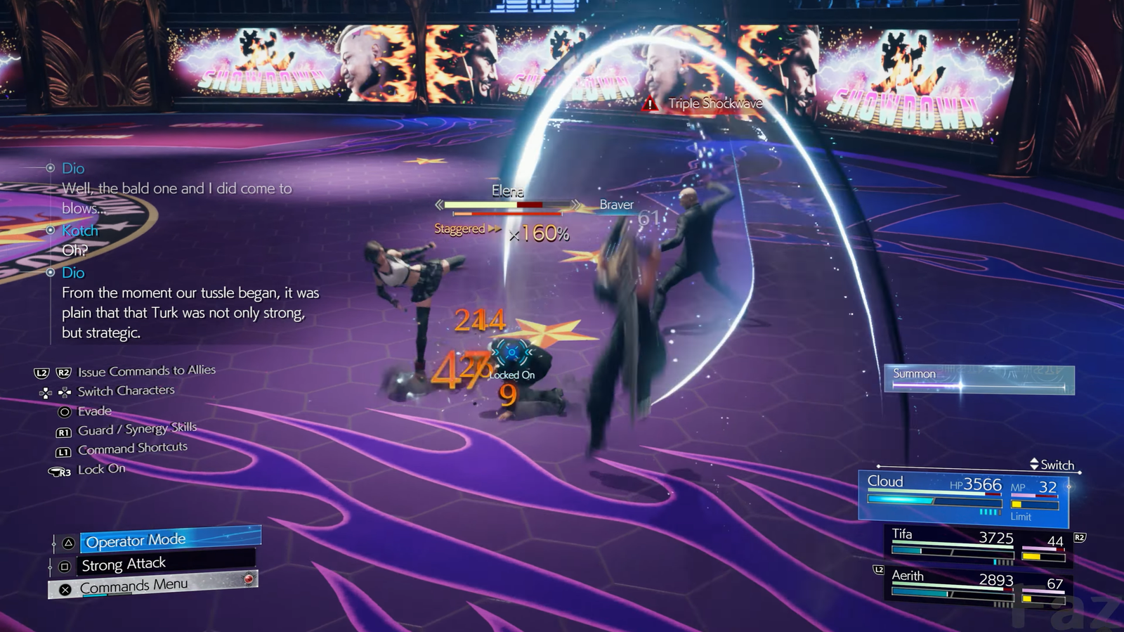 The original Final Fantasy VII released in 1997 on the PlayStation. With twenty-seven years of controller and hardware advancement between 1997 and 2024, Rebirth’s developers are given more creative freedoms when designing combat mechanics and gameplay. Shown above are Cloud, Tifa, and Aerith fighting the Turks, Rude and Elena, in a grudge rematch at Dio’s Musclehead Colosseum. In the foreground, Cloud and Tifa wail on a fatigued Elena. Tifa uses a normal attack roundhouse kick and Cloud uses Braver, a heavy falling sword slash ability. Elena has sustained significant damage and has a “Staggered” title beneath her health bar followed by x160% multiplier; the Staggered bar has almost depleted. Orange numbers surround her character model while the blue words “Locked On” and a little blue crosshair-and-target appear directly on her model. Cloud has the word “Braver” in blue above his head and Rude has the words “Triple Shockwave” in red above his head, preceded by a red, triangle warning symbol with an exclamation point in the center. To the right, the summon bar and character stats are presented. The summon bar is currently filling up and the player can summon a powerful creature from their arsenal once the bar is full. Underneath the summon bar, the character stats show each character’s remaining HP and MP, LIMIT Gauge, ATB Gauge (horizontal and under HP bar), and Synergy Gauge (vertical bars under the ATB Gauge); the active character is Cloud, denoted by his name card being highlighted in blue. Tifa and Aerith have an R2 and L2 next to their card respectively, alerting the player they can be issued orders using their respective button (also shown on left side). To the left, a Commands Menu is available along with Operator Mode and Strong attack. Each character has a unique combat ability for their normal attacks; for example, Cloud is currently in Punisher Mode using Strong Attacks and has the choice to switch back and forth with Operator mode, which uses quicker/weaker normal attacks. In the Commands Menu, the character’s physical/magic abilities and synergy skills lie. Here, ATB can be expended for powerful physical/elemental abilities and synergy charges for synergy abilities. Above these combat characteristics are helpful tips from the game to remind the player of their options such as guarding, dodging, and locking on. To the upper Left, commentary is given by people not actively in combat. As the combatants fight, Dio and Kotch, the owner of the establishment and an announcer, banter about their experiences; these dialogues are not important to the fight at hand, but are entertaining to listen to. The fighters brawl in an expansive, grandiose arena, decorated with deep purple flames on the floor, Dio’s logo in the center of the arena, and promotional poster walling the arena.